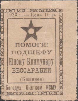 1923 1923 г. Разм. 44 х 58 мм. Одноцветная печать на желтоватой бумаге. Нерегулярная зубц. В двойной прямоугольной декоративной рамке разм. 36 х 49 мм в центре текст в пять строк: «Помоги! Подшефному Юному Коммунару Бессарабии (Кишинев)». Сверху пятиконечная звезда. Сверху между рамками текст: «1923 г. – Цена 10 р.». Внизу между рамками текст: «Богодух[овский]. Окрком КСМУ».