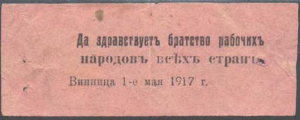 1917 1917 г. 01.05.1917 г. Разм. 71 х 28 мм. Одноцветная печать на тонкой розовой бумаге. В центре текст в три строки: «Да здравствует братство рабочих народов всех стран. Винница 1-е мая 1917 г.».