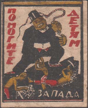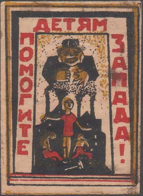 1923 1923 г. Трехцветная печать низкого качества на кремовой бумаге. В прямоугольной рамке в центре аллегорические рисунки. По внутреннему периметру рамки текст: «Помогите детям запада!».