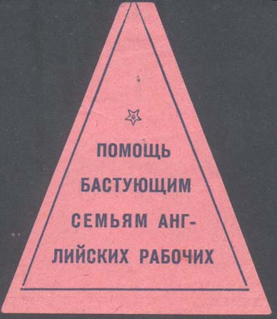 0 0 г. Треугольник разм. рамки 54 х 68 мм. Одноцветная печать на плотной розовой бумаге. В треугольной рамке сверху пятиконечная звезда. Ниже текст в четыре строки: «Бастующим семьям английских рабочих».