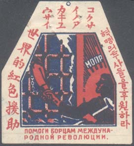 1926 1926 г. Виньетка шестиугольной формы разм. 45 х 49 мм. Двухцветная печать на белой бумаге. В центре эмблема МОПР. По периметру текст на русском, китайском и корейском языках: «Помоги борцам международной революции».
