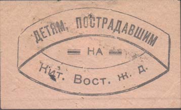 1929 1929 г. 15.10.1929 г. Разм 60 х 37 мм. Одноцветная печать на тонкой розово-серой бумаге. В центре в двойной рамке сложной формы текст в три строки: «Детям, пострадавшим на Кит[айской]. Вост[очной]. ж. д.».