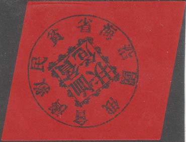 1929 1929(?) г. Виньетка в форме параллелограмма разм. 54 х 46 мм. Одноцветная печать на бумаге различных цветов. В центре в круглой рамке диаметром 37 мм в прямоугольной декоративной рамке четыре иероглифа. По внутреннему периметру рамки текст на японском языке.