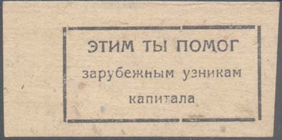 1930 1930(?) г. Разм. 65 х 32 мм. Одноцветная печать на плотной серой бумаге. В прямоугольной рамке разм. 47 х 22 мм текст в три строки: «Этим ты помог зарубежным узникам капитала».
