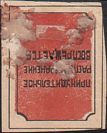1923 1923 г. Разм. рамки 51 х 71 мм. Трехцветная печать на толстой белой бумаге. В центре в прямо-угольной рамке разм. 48 х 56 мм аллегорический рисунок: На фоне извергающегося вулкана по морю плывет корабль с надписью на борту «Ленин» и серпом и молотом. С корабля матрос бросает спасательный круг, на котором текст: «СССР трудящимся Японии». Внизу под рисунком текст в четыре строки: «Граждане помогайте трудящимся 1923 Японии 1923».
