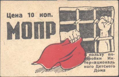 1931 1931 г. 08.11.1931 г. Разм. 70 х 45 мм. Двухцветная печать на плотной кремовой бумаге. Справа эмблема МОПР. В правом нижнем углу текст в пять строк: «В пользу постройки Интернационального Детского Дома». В левом верхнем углу текст в две строки: «Цена 10 коп. МОПР».