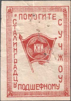 1930 1930(?) г. Одноцветная печать на плотной белой бумаге. В двойной прямоугольной декоративной рамке разм. 35 х 50 мм с серпами и молотами по углам в центре комсомольский значок. По внутреннему периметру рамки текст: «Сталинградцы, помогите подшефному Сучжоу».