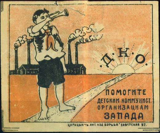 1924 1924 г. Разм. 79 x 67 мм. Многоцветная печать на плотной белой бумаге. В прямоугольной рамке разм. 72 x 60 мм пионер-горнист на фоне завода и восходящего солнца с буквами «Д.К.О» на лучах. Внизу текст в четыре строки: «Помогите детским коммунист[ическим]. организациям Запада». Внизу под рамкой выходные данные мелким шрифтом: «Царицын н/В. Лит. изд. «Борьба» Советская 27». По углам знака разграничительные линии.