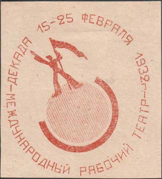 1932 1932 г. 15-25.02.1932 г. Разм. 54 х 59 мм. Одноцветная печать на тонкой желтоватой бумаге. В центре символическое изображение рабочего с красным флагом, стоящего на земном шаре. По окружности текст: «Декада 15-25 февраля 1932 г. – международный рабочий театр».