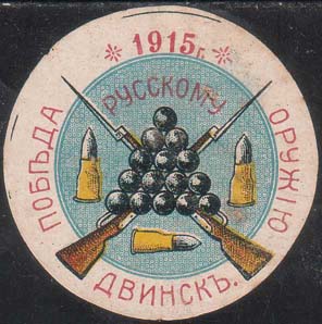 1915 1915 г. Круг диаметром 49 мм. Многоцветная печать на желтоватой бумаге с мелованным верхним слоем. В центре в двойной круглой рамке диаметром 35 мм на сплошном фоне скрещенные винтовки, картечь и патроны. По наружному периметру рамки текст: «1915 г. Двинск. Победа русскому оружию».