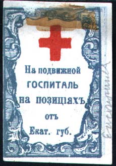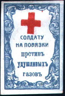 1915 1915(?) г. Разм. 37 х 56 мм. Двухцветная двухсторонняя печать на сероватой бумаге. На лицевой стороне в декоративной рамке разм. 33 х 51 мм сверху красный крест. В центре текст в пять строк: «Солдату на повязки от удушливых газов». На оборотной стороне в такой же рамке сверху красный крест. Ниже текст в пять строк: «На подвижной госпиталь на позициях от Екат[еринославской]. Губ[ернии].».