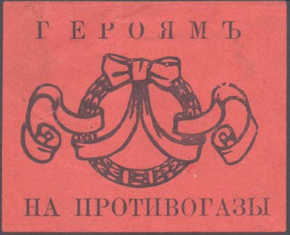 1915 1915(?) г. Разм. 68 х 56 мм. Одноцветная печать на красной бумаге. В центре венок с лентами. Сверху текст: «Героям». Внизу продолжение текста: «На противогазы».