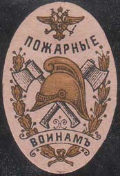 1915 1915 г. 17.12.1915 г. Овал разм. 28 х 43 мм. Двухцветная печать на бумаге различных цветов. В центре в обрамлении венка каска пожарного на фоне скрещенных пожарных топориков. Сверху герб России и текст: «Пожарные». Внизу продолжение текста: «Воинам».