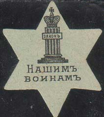 1915 1915(?) г. Виньетка в виде шестиконечной звезды разм. 34 х 40 мм. Одноцветная печать на зелено-серой бумаге. В центре эмблема судебного ведомства, внизу текст в две строки: «Нашим воинам».