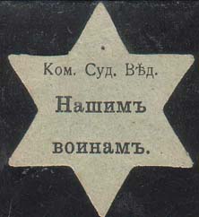 1915 1915(?) г. Виньетка в виде шестиконечной звезды разм. 34 х 40 мм. Одноцветная печать на зелено-серой бумаге. В центре текст в три строки: «Ком[итет]. Суд[ебного]. Вед[омства]. Нашим воинам».