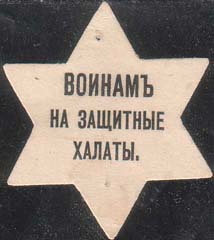 1915 1915(?) г. Виньетка в виде шестиконечной звезды разм. 34 х 40 мм. Одноцветная печать на белой бумаге. В центре текст в три строки: «Воинам на защитные халаты».