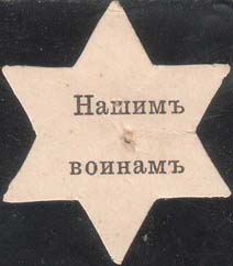 1915 1915(?) г. Виньетка в виде шестиконечной звезды разм. 34 х 40 мм. Одноцветная печать на белой бумаге. В центре текст в две строки: «Нашим воинам».
