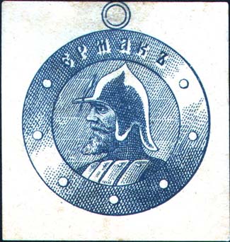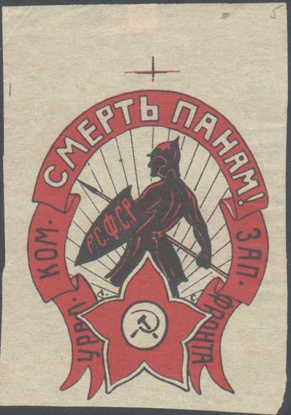 1920 1920 г. Разм. ≈ 65 х 82 мм. Двухцветная печать на тонкой сероватой (оттенки) бумаге. В центре в лучах восходящего солнца аллегорическое изображение красноармейца с копьем и щитом. На щите аббревиатура «Р.С.Ф.С.Р.». На ленте полукругом текст: «Урал[ский]. Ком[итет]. Зап[адного]. Фронта. Смерть панам!» Внизу пятиконечная звезда с серпом и молотом в центре.
