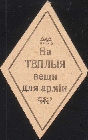 1915 1915(?) г. Ромб разм. 53 х 80 мм. Одноцветная печать на желтоватой бумаге. В рамке в форме ромба разм. 45 х 70 мм в центре текст в четыре строки: «На теплые вещи для армии». Сверху и снизу декоративные элементы.