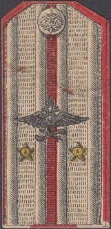 1916 1916 г. Виньетка в виде погона разм. 27 х 56 мм. Одноцветная и трехцветная печать на белой бумаге. Погон подпоручика с авиационным значком. Сбор на аэроклуб.