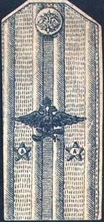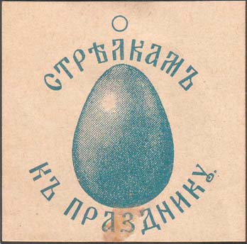 1915 1915(?) г. Разм. 58 х 57 мм. Одноцветная печать на плотной кремовой бумаге. В центре пасхальное яйцо. Сверху и снизу полукругом текст: «Стрелкам к празднику». Сверху кружок для обозначения места прокола булавкой для крепления.