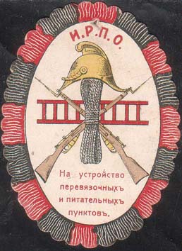 1915 1915(?) г. Виньетка в виде овала разм. 43 х 58 мм. Много-цветная печать на плотной глянцевой белой бумаге. В декоративной овальной рамке в центре скрещенные винтовки, моток веревки и лестница. Выше пожарная каска. Сверху аббревиатура «И.Р.П.О.». Внизу текст в четыре строки: «На устройство перевязочных и питательных пунктов».