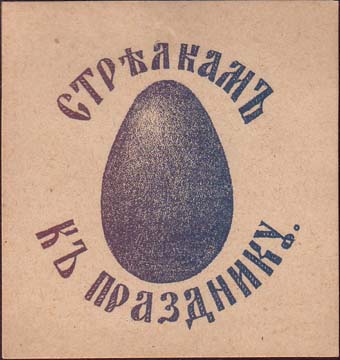 1914 1914 г. 05.-06.05 1914 г. Разм. 57 х 60 мм. Одноцветная печать на плотной кремовой бумаге. В центре пасхальное яйцо. Сверху и снизу полукругом текст: «Стрелкам к празднику».
