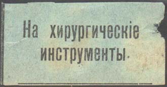 1915 1915(?) г. Разм. 56 х 28 мм. Одноцветная печать на светло-зеленой бумаге. В центре текст в две строки: «На хирургические инструменты».