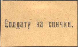 1915 1915(?) г. Разм. 46 х 27 мм. Одноцветная печать на желтой бумаге. В центре текст: «Солдату на спички».