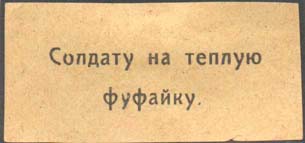 1915 1915(?) г. Разм. 50 х 24 мм. Одноцветная печать на оранжево-серой бумаге. В центре текст в две строки: «Солдату на теплую фуфайку».