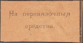 1915 1915(?) г. Разм. 55 х 28 мм. Одноцветная печать на желто-серой бумаге. В центре текст в две строки: «На перевязочные средства».