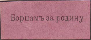 1915 1915(?) г. Разм. 55 х 28 мм. Одноцветная печать на розово-фиолетовой бумаге. В центре текст: «Борцам за родину».