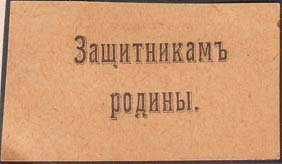1915 1915(?) г. Разм. 55 х 28 мм. Одноцветная печать на желтой бумаге. В центре текст в две строки: «Защитникам Родины».
