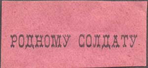 1915 1915(?) г. Разм. 55 х 28 мм. Одноцветная печать на розовой бумаге. В центре текст: «Родному солдату».