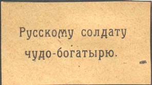 1915 1915(?) г. Разм. 55 х 28 мм. Одноцветная печать на желтой бумаге. В центре текст в две строки: «Русскому солдату чудо-богатырю».
