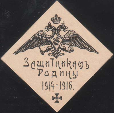 1916 1916 г. Ромб разм. 62 х 62 мм. Одноцветная печать на сероватой бумаге. Сверху стилизованное изображение герба России. Ниже текст в три строки: «Защитникам Родины 1914 – 1916.». Внизу георгиевский крест.