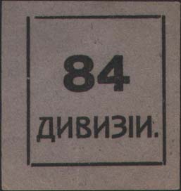 1916 1916 г. 07.07.1916 г. Разм. 44 х 46 мм. Одноцветная печать на серо-синей бумаге. В прямоугольной рамке разм. 33 х 36 мм текст в две строки: «84 дивизии».