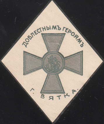 1916 1916 г. 26.11.1916 г. Ромб разм. 60 х 71 мм. Двухцветная печать на белой бумаге. В центре георгиевский крест. Сверху полукругом текст: «Доблестным героям». Внизу полукругом текст: «г. Вятка».