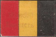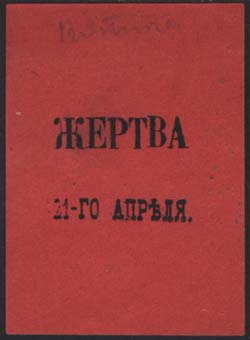 1916 1916(?) г. Разм. 40 х 56 мм. Одноцветная печать на розово-красной бумаге. В центре текст в две строки: «Жертва 21-го апреля».