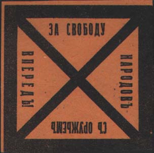 1917 1917 г. 05.-06.10.1917 г. Разм. 49 х 49 мм. Одноцветная печать на бу-маге различных цветов. По периметру знака толстая прямоугольная рамка, поле разделено толстыми диагональными линиями на четыре части. По периметру внутри рамки текст: «За свободу народов с оружием вперед!».