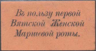 1917 1917(?) г. Разм. 55 х 29 мм. Одноцветная печать на оранжево-красной бумаге. В центре текст в три строки: «В пользу первой Вятской Женской Маршевой роты».