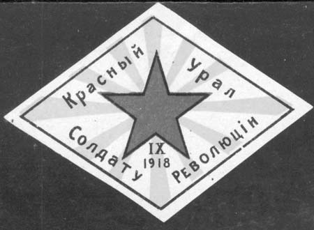1918 1918 г. Ромб разм. 77 х 55 мм. Трехцветная печать на плотной белой бумаге. В рамке в форме ромба в центре пятиконечная звезда с лучами. Под звездой дата: «IX 1918». По периметру рамки текст: «Красный Урал Солдату Революции».