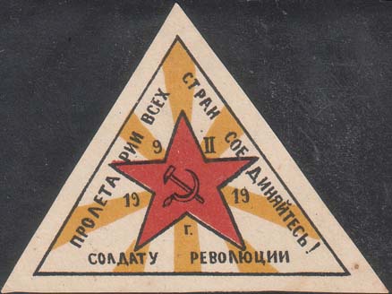 1919 1919 г. 09.02.1919 г. Виньетка в форме треугольника разм. рамки 61 х 45 мм. Трехцветная печать на белой бумаге. В центре красная звезда с серпом и молотом. Между лучами звезды дата: «9.II.1919 г». По периметру рамки текст: «Пролетарии всех стран соединяйтесь! Солдату революции».