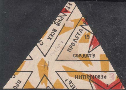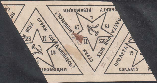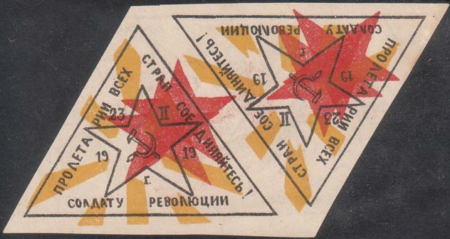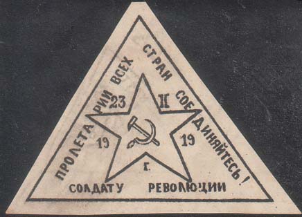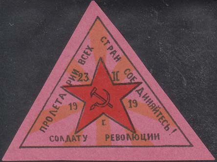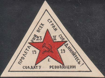 1919 1919 г. 23.02.1919 г. Виньетка в форме треугольника разм. рамки 61 х 45 мм. Трехцветная печать на бумаге различных цветов. В центре красная звезда с серпом и молотом. Между лучами звезды дата: «23.II.1919 г». По периметру рамки текст: «Пролетарии всех стран соединяйтесь! Солдату революции».
