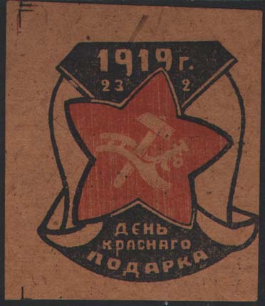 1919 1919 г. 23.02.1919 г. Разм. 61 х 70 мм. Двухцветная печать на толстой светло-коричневой бумаге. В центре на фоне картуша сложной формы пятиконечная звезда с плугом и молотом в центре. Сверху дата: «1919 г. 23 2». Внизу текст в три строки: «День красного подарка».