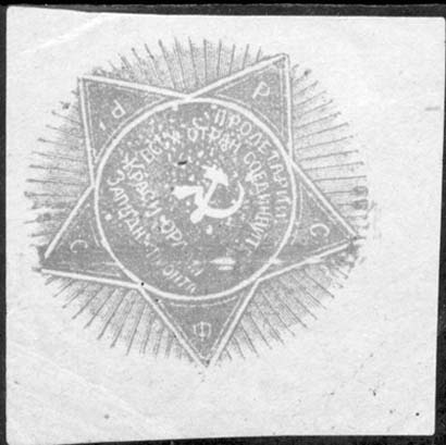 1920 1920(?) г. Разм. 65 х 65 мм. Одноцветная печать на желтоватой бумаге. В центре пятиконечная звезда, на лучах которой буквы: «Р.С.Ф.С.Р.». В центре в круге серп и молот и текст: «Пролетарии всех стран соединяйтесь. Красн[ым]. орлам Западн[ого] фронта».