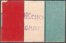 1915 1915(?) г. Разм. 36 х 25 мм. Трехцветная печать на белой бумаге. Виньетки в виде флагов стран-союзниц России в первой мировой войне. Фиолетовая горизонтальная надпечатка каучуковым штампом в две строки: «Женский комитет».