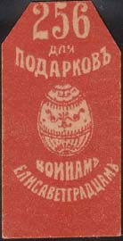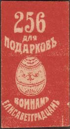 1915 1915(?) г. Разм. 24 х 43 мм. Одноцветная печать на плотной желтоватой бумаге. В центре пасхальное яйцо. Сверху текст в три строки: «256 для подарков». Внизу продолжение текста в две строки: «Воинам Елисаветградцам».