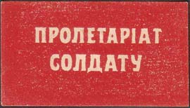 1917 1917 г. Разм. 46 х 26 мм. Одноцветная печать на белой бумаге. Текст в две строки: «Пролетариат солдату».