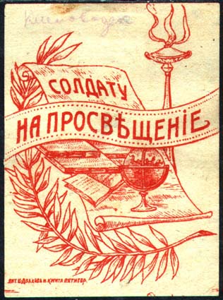 1915 1915(?) г. Разм. 51 х 70 мм. Одноцветная печать на желтоватой бумаге. В центре книги, глобус, лавровая ветвь и светильник. На ленте текст: «Солдату на просвещение». Слева внизу мелким шрифтом выходные данные: «Лит. Дзакова и Кмата Пятигор.».